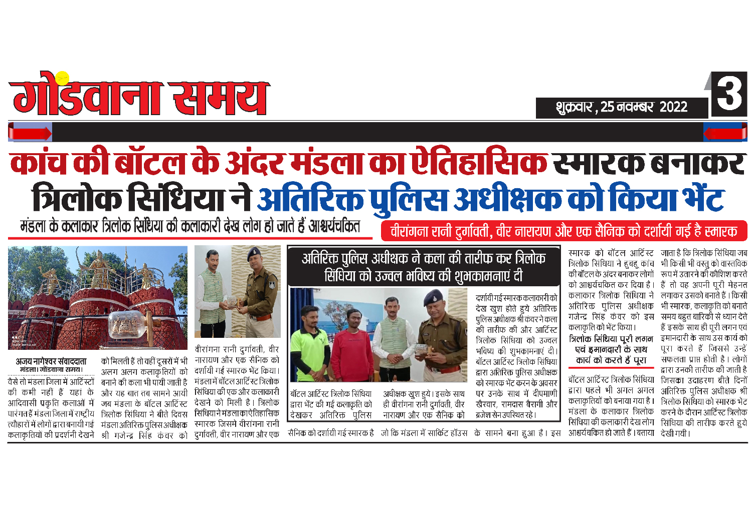 मंडला का ऐतिहासिक स्मारक बनाकर त्रिलोक सिंधिया ने अतिरिक्त पुलिस अधीक्षक को किया भेंट